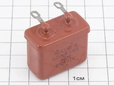 К73П-2 400В 0,5 мкФ 10% конденсатор пленочный полиэтилентерефталатный с металлизированными обкладками непропитанный. Выпускается в цилиндрических (вариант 1) и прямоугольных (вариант 2) корпусах. Предназначен для работы в цепях постоянного, переменного и пульсирующего токов.